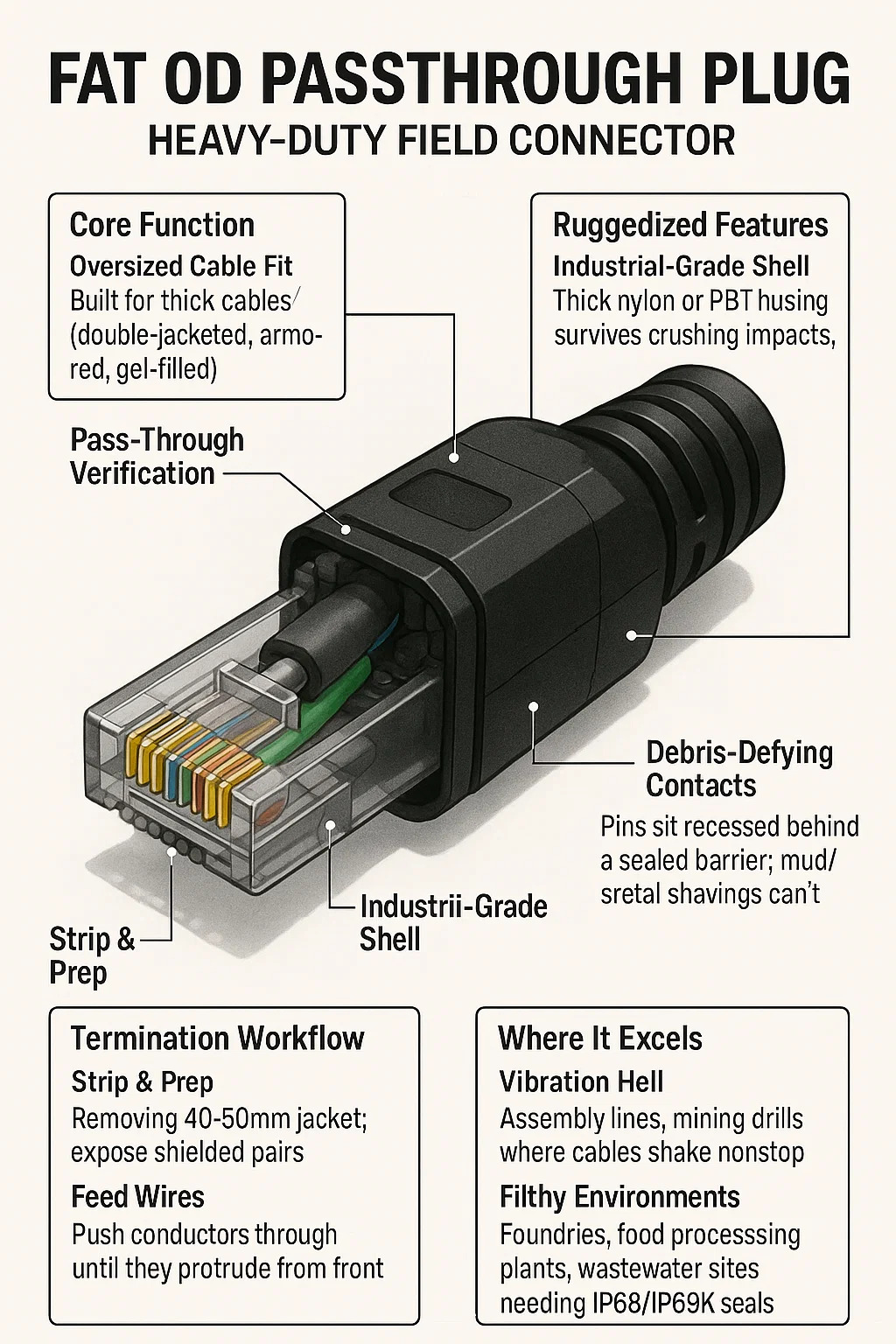 Kabel besar yang sesuai: Dibina untuk kabel tebal (double-jacketed, perisai, gel penuh) yang tidak sesuai dengan palam standard.