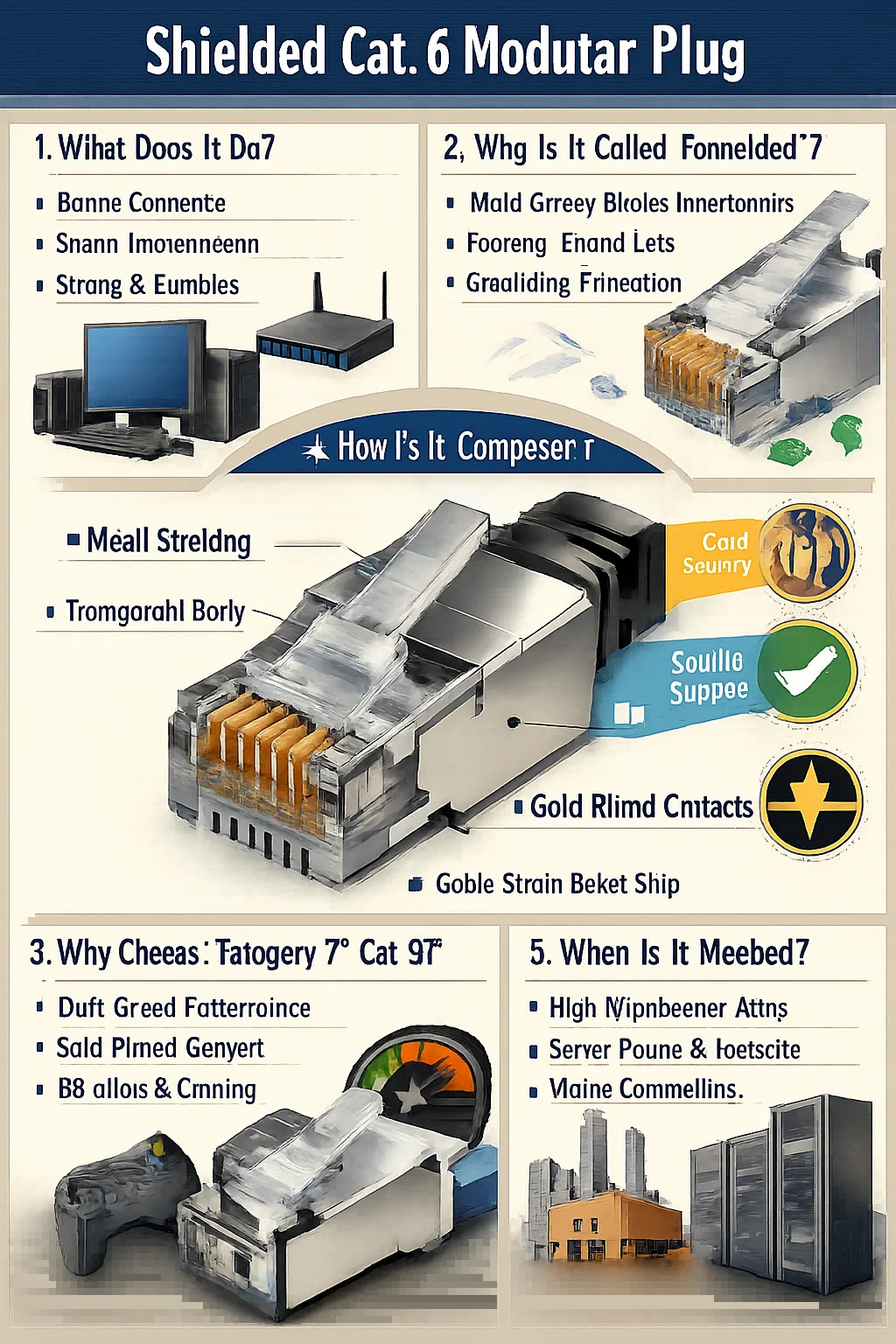 ini palam modular Cat.6 terlindung , secara ringkasnya, ialah penyambung kabel rangkaian dengan "perisai pelindung." Jika anda pernah melihat penyambung kabel rangkaian dengan sarung logam berkilat, itu sahaja.