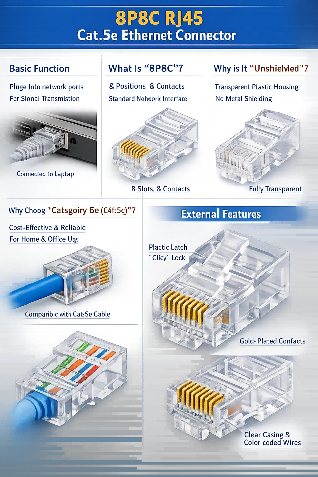 ini palam modular 8P8C Cat.5e tanpa pelindung sebenarnya adalah jenis "penyambung RJ45" yang paling biasa ditemui dalam banyak rangkaian jalur lebar rumah, pada masa lalu dan sekarang. Ia telus, padat dan komponen asas untuk menyambung ke rangkaian.